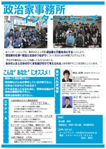 本インターンシップは、春休みの2ヶ月間政治家と行動を共にする事により、政治家の仕事や政治と社会のつながりについて知るための体験プログラムです。
