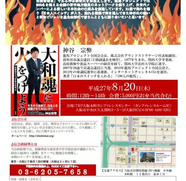 第15回志信会政経塾は、吹田市議会議員を2期務め「龍馬プロジェクト全国会 会長」である神谷宗幣氏をお迎えします。